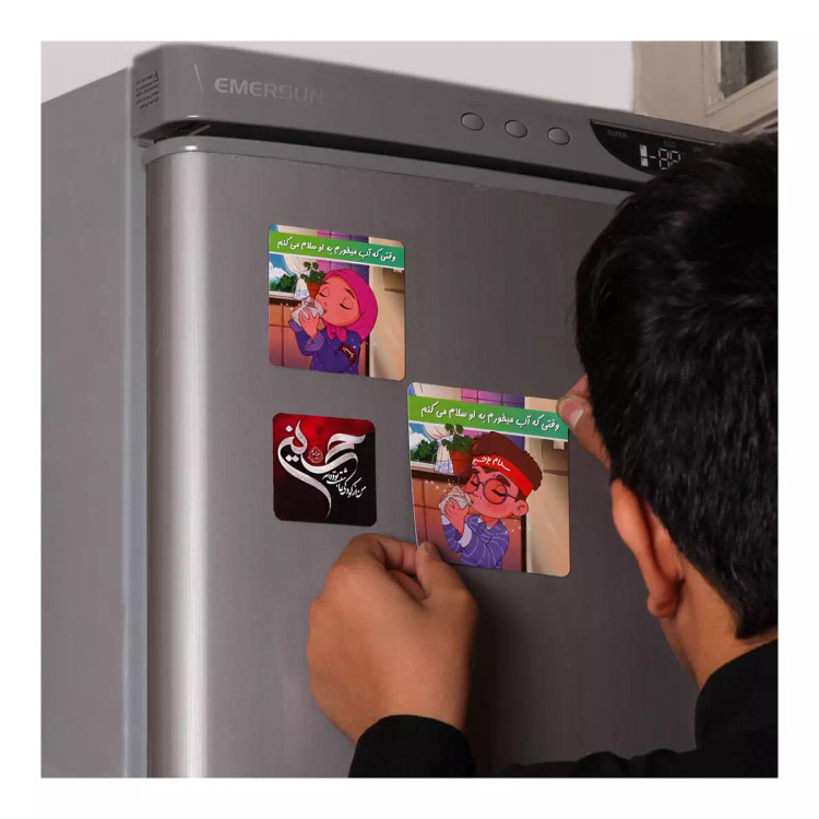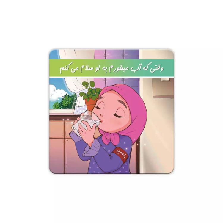 بر روی مگنت عبارت "وقتی که آب می خورم به او سلام می کنم" نوشته شده است.